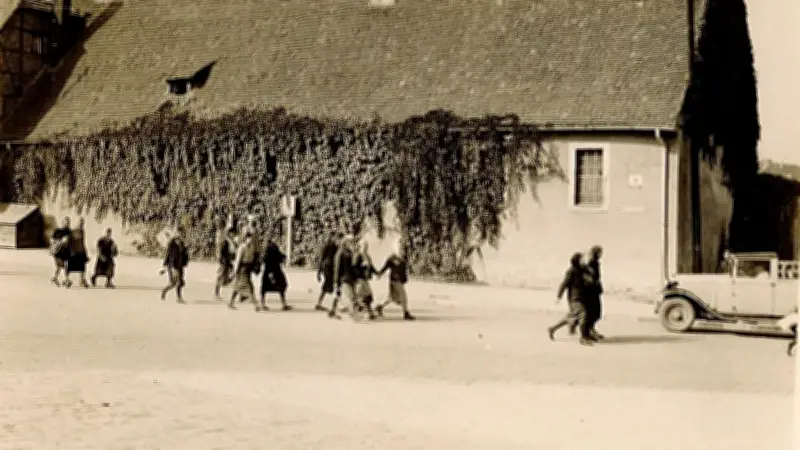 Ein Foto aus dem Spengler-Museum zeigt Zwangsarbeiterinnen der Mifa auf dem Weg ins Lager Bonnhöfchen. Weil ihnen aus rassistischen Gründen die Nutzung des Bürgersteigs untersagt war, mussten sie auf der Straße gehen. Diese alltägliche Diskriminierung war charakteristisch für das System der NS-Zwangsarbeit, das Menschen nach rassistischen Kriterien hierarchisierte und entrechtete.