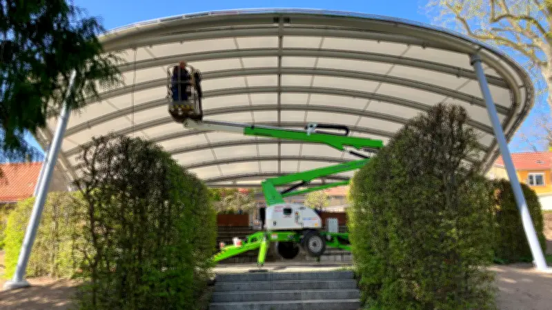 Wichtig sei allen gewesen, dass die Sicht aufs Wasser nicht verbaut wird. Das sei gelungen. Auch der Blick in die Gegenrichtung sei weiterhin ein Augenschmaus, das Haus des Gastes mit den angrenzenden Gebäuden in der historischen Altstadt sei immer noch gut zu sehen. Das Stahlgestell mit acht im Boden verankerten und einbetonierten Pfeilern wiege 15 Tonnen. Die Membran obendrauf sei mit 600 Kilogramm vergleichsweise leicht. Als unscheinbares Bündel, das auf eine Europalette passte, sei sie geliefert worden. Erst beim Auseinanderfalten habe sie ihre ganze Pracht offenbart – und auch ihre Tücken. 20 freiwillige Helfer hätten mit angepackt, um die Spezialplane richtig herum an ihren Platz zu hieven.