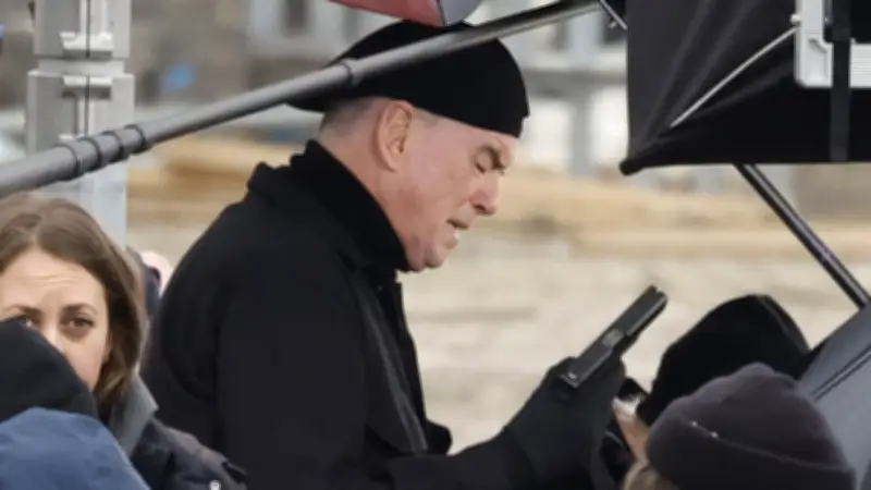 Auch Helen Mirren erscheint komplett in Schwarz. Mit Mütze und Handschuhen steht die Hollywood-Ikone vor der Kamera und hält entschlossen ein Maschinengewehr in den Händen. Sie wirkt sichtbar konzentriert und voll in ihrer Rolle. Zwischen Technikfahrzeugen, Kameraequipment und Crew entsteht eine dichte Crime-Atmosphäre, die perfekt zur Gangster-Serie „MobLand“ passt, für die die neuen Szenen gedreht werden.