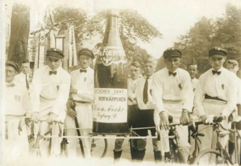 Ein besonderes Highlight der kommenden Ausstellung ist eine historische Aufnahme des Freyburger Radfahrvereins. Die Mitglieder posieren in weißen Hemden mit Fliegen und Mützen – ein ungewöhnlich adrettes Erscheinungsbild für Radfahrer jener Zeit. Die Fotografie zeigt die Vereinsmitglieder nicht nur mit ihren Rädern, sondern auch mit einer riesigen Flasche Rotkäppchen-Sekt, was auf einen festlichen Anlass hindeutet.