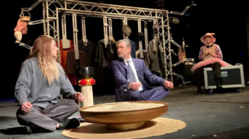 Für die schnellen Rollen- und Schauplatzwechsel hat das Team eine innovative Lösung gefunden: Kostüme und Requisiten sind durchgängig auf einer Traversenkonstruktion präsent. „So wie bei einem Puppenspieler, der auch immer alle seine Figuren zur Hand hat“, erklärt Bühnen- und Kostümbildnerin Gesine Ullmann.