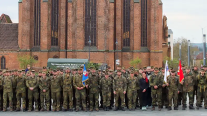 Vor dem größten Gotteshaus Prenzlaus fand eine bewegende Andacht statt, bei der der gefallenen Soldaten gedacht wurde. Im Anschluss postierten sich die Teilnehmer für Pressefotos vor der historischen Marienkirche, wodurch die Zeremonie zusätzliche Symbolkraft erhielt.