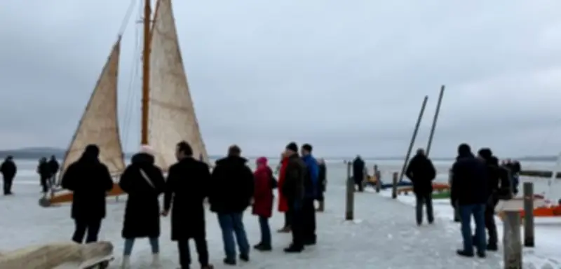 Die Papagena ist ein besonderes Exemplar mit einer Segelfläche von 65 Quadratmetern und drei Kufen, das nach Bauplänen aus dem Jahr 1905 konstruiert wurde. Gebaut wurde der Eissegler bereits 1996 in einer finnischen Werft, doch erst jetzt, nach acht Jahren Wartezeit auf den richtigen Winter, konnte Besitzer Matthias Sponholz das Gefährt mit seinen Söhnen auf das Eis bringen. Am vergangenen Wochenende pilgerten Hunderte Menschen zum Borkenstrand, um einen Blick auf dieses seltene Wintervergnügen zu werfen.