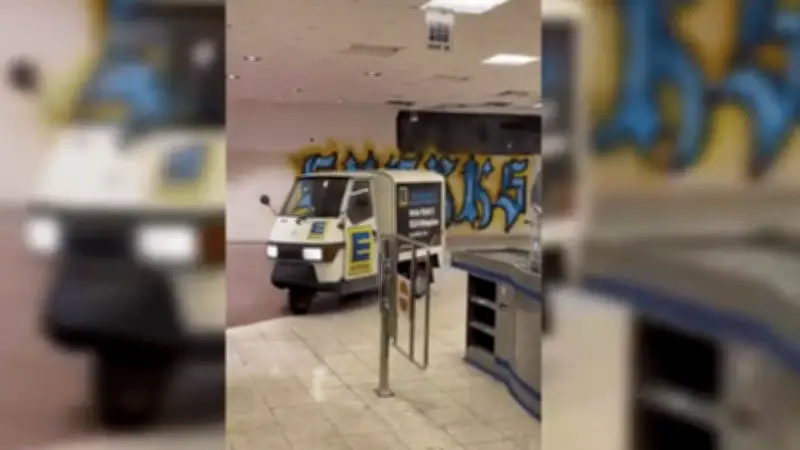Kultige Ape donnert durch abgerissenen Edeka: Abschiedsfahrt im Supermarkt wird zum Internet-Hit