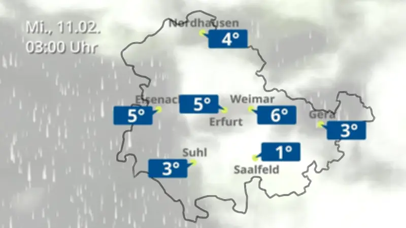 Eine aktuelle Wetteranimation bietet einen umfassenden Blick auf die Wetterentwicklung in Thüringen. Die Prognose, die am 10. Februar 2026 um 18:10 Uhr erstellt wurde, zeigt vor allem Regen und Wolken, die über dem Bundesland aufziehen. Besonders betroffen sind die Städte Erfurt, Gera und Eisenach, wo mit anhaltenden Niederschlägen und bedecktem Himmel zu rechnen ist.