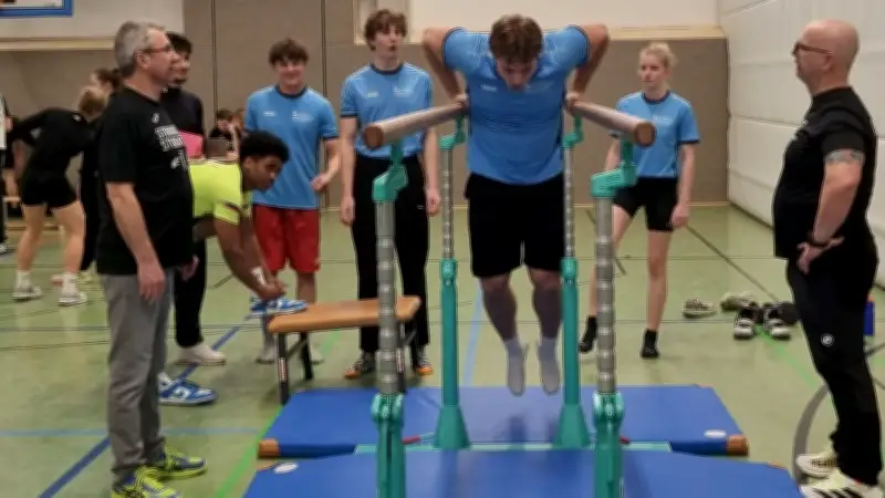 Draußen scheint die Sonne, doch in der Halle herrscht eine konzentrierte Atmosphäre, in der Schweiß und Anstrengung im Vordergrund stehen. Die Teilnehmer bereiten sich intensiv vor, die Anspannung ist fast greifbar. Ein Beugestütz wird ausgeführt, gefolgt von einem Moment der Ruhe und des Durchatmens. Die Arme zittern noch nicht, aber die Schultern beginnen bereits zu brennen unter der Belastung. Dennoch ziehen sich die jungen Sportler hoch, einmal, zweimal und immer wieder, um ihre Kraft und Ausdauer unter Beweis zu stellen.