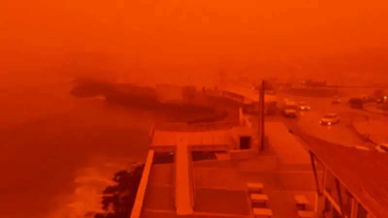 Die Luft über Kreta ist derzeit mit feinen Sandpartikeln aus der Sahara gesättigt, die das Sonnenlicht in einem intensiven Rotton streuen. Dieses Wetterphänomen, das typischerweise im Frühjahr auftritt, hat diesmal eine besonders starke Intensität erreicht. Die gesamte Insel, bekannt für ihre azurblauen Meere und grünen Landschaften, erscheint wie in einen blutroten Schleier getaucht.