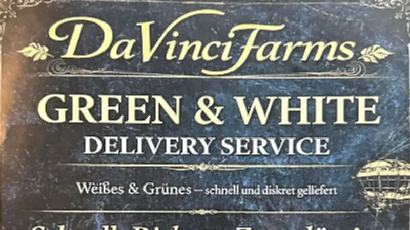 Der Flyer, der in DIN-A5-Größe in Berliner Briefkästen landet, präsentiert sich im schwarzen Retro-Design. Der Anbieter nennt sich "DaVinciFarms" und wirbt unter dem Slogan "Green & White Delivery Service" offensiv für "Weißes & Grünes" – eine eindeutige Bezeichnung für Kokain und Marihuana. Die Versprechen klingen professionell: "Schnell. Diskret. Zuverlässig."