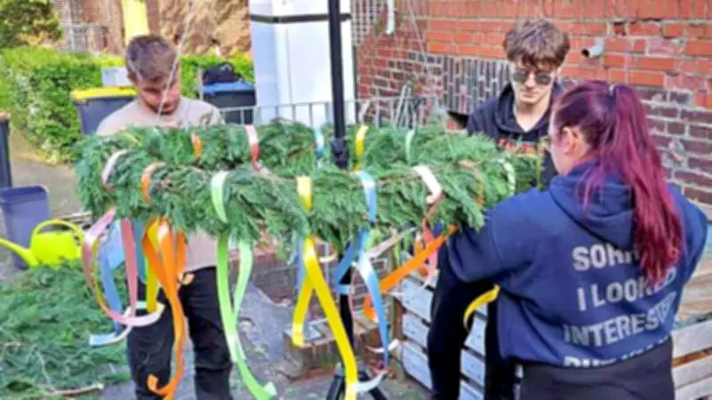 Bereits am vergangenen Freitag haben Jugendliche des Jugentreffs und des Heimatvereins den neuen Maikranz gebunden. Der alte Kranz war im Dezember zu einem Adventskranz umgestaltet worden und schmückt seitdem das weihnachtliche Vereinsfest. „Da dieser Kranz noch sehr gut aussieht, haben wir ihn im Adventsoutfit mit Lichterkette und Weihnachtsschmuck belassen“, erklärt Claus. Für den Mai wurde daher ein neuer Kranz gestaltet, sodass nun zwei Kränze für die jährlichen Anlässe zur Verfügung stehen.