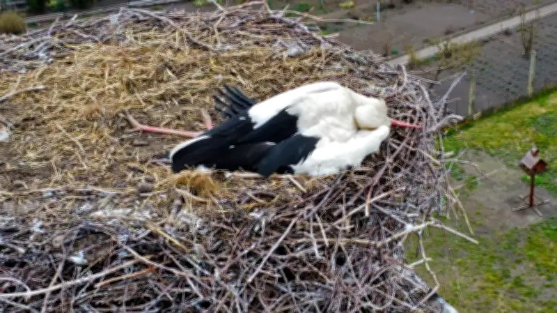 Bewegungslos im Nest: Die Drohnenbilder, die von Frank Gehrmann aufgenommen wurden, ließen bereits das Schlimmste vermuten. Die regungslose Störchin auf dem Schornstein löste bei den Anwohnern große Besorgnis aus. Die Bilder zeigten deutlich, dass das Tier nach dem Kampf nicht mehr in der Lage war, sich zu bewegen oder zu fliegen.