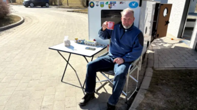 Sein Fahrradwohnmobil ist gerade einmal zwei Meter lang, 90 Zentimeter breit und etwa einen Meter hoch. „Am Kopf und an den Füßen ist noch Platz“, sagt er und lacht. Anfangs sei es an den Seiten etwas eng gewesen, doch daran habe er sich gewöhnt. Am liebsten übernachtet er auf Wohnmobilplätzen oder an Wasserwanderrastplätzen, weil es dort Strom und Wasser gibt und Menschen, mit denen er leicht ins Gespräch kommt. Sein ungewöhnliches Gefährt zieht fast überall neugierige Blicke auf sich.