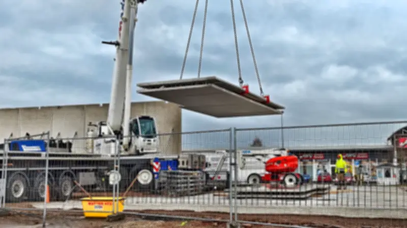 Die Bauarbeiten schreiten planmäßig voran, mit einem Fokus auf Präzision und Effizienz. Die Verwendung von vorgefertigten Betonteilen, die per Kran eingehoben werden, beschleunigt den Prozess und minimiert Störungen im umliegenden Bereich. Dieses Vorgehen ist typisch für moderne Bauprojekte, die Zeit- und Kosteneffizienz priorisieren.